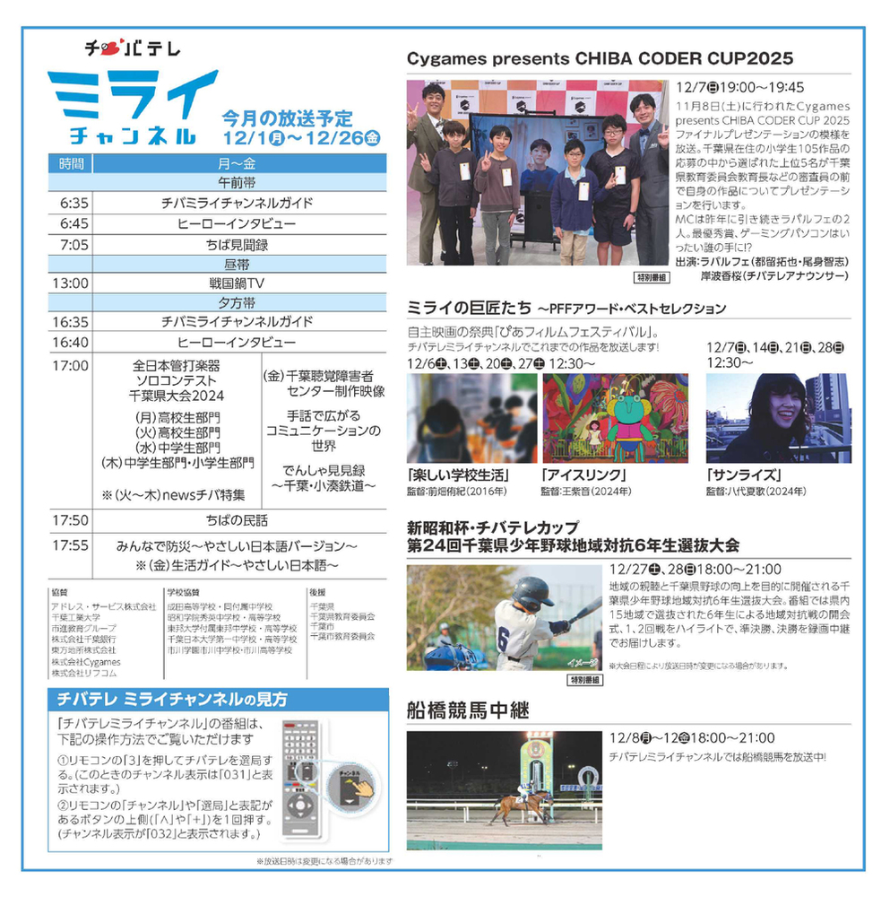 これを機に第2チャンネルを『チバテレミライチャンネル』と変更し、子ども達を中心とした様々な方へ向けた「未来のため」のチャンネルへと進化いたします。