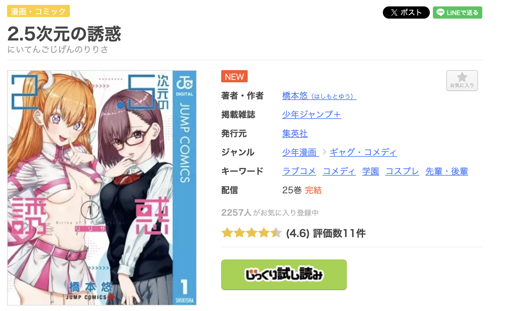 漫画《2.5次元の誘惑》は完結しており、全話少年ジャンプ+で読むことができます。