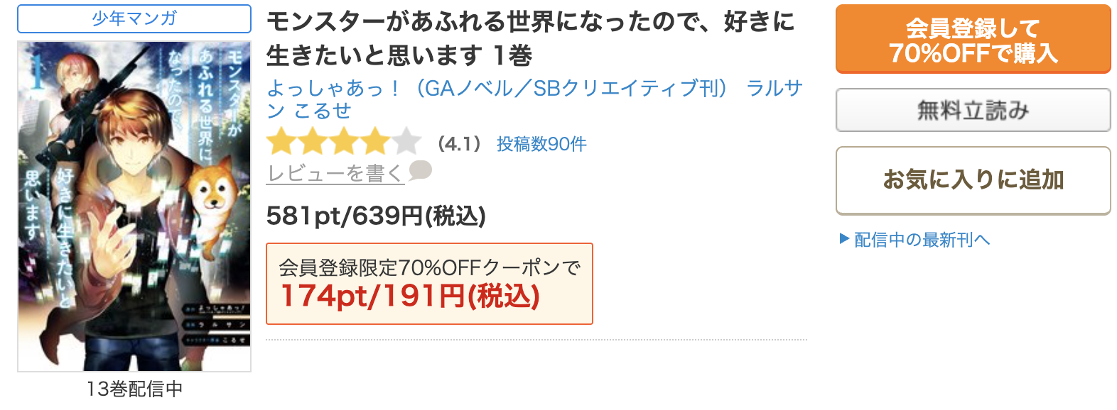 全巻無料ではないものの、クーポンやポイント還元で一番お得に漫画《モンスターがあふれる世界になったので、好きに生きたいと思います》を読むことができます。