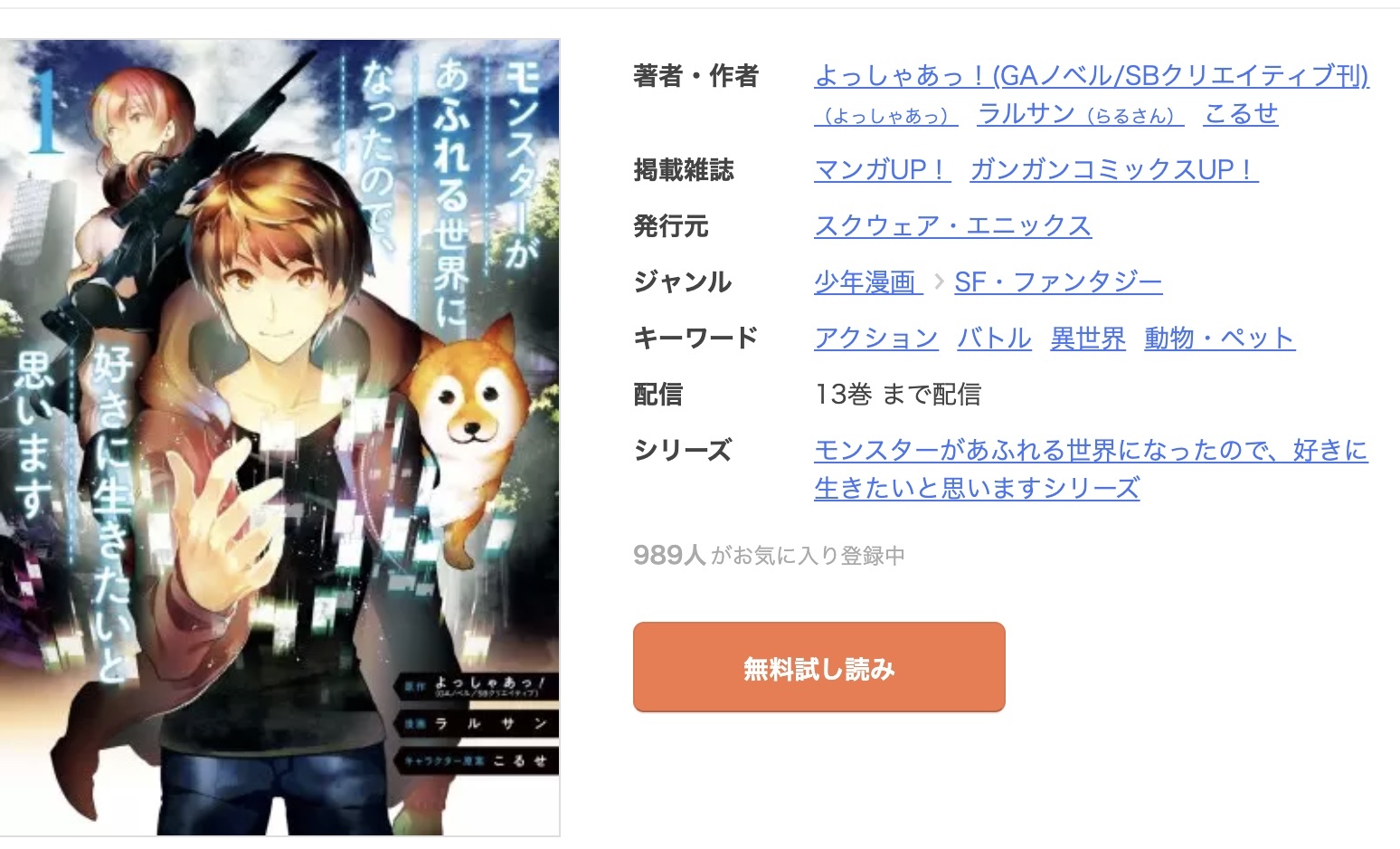 漫画《モンスターがあふれる世界になったので、好きに生きたいと思います》は、マンガUP!/ガンガンコミックスUP!で連載されている漫画で、単行本は全13巻まで発売されています。