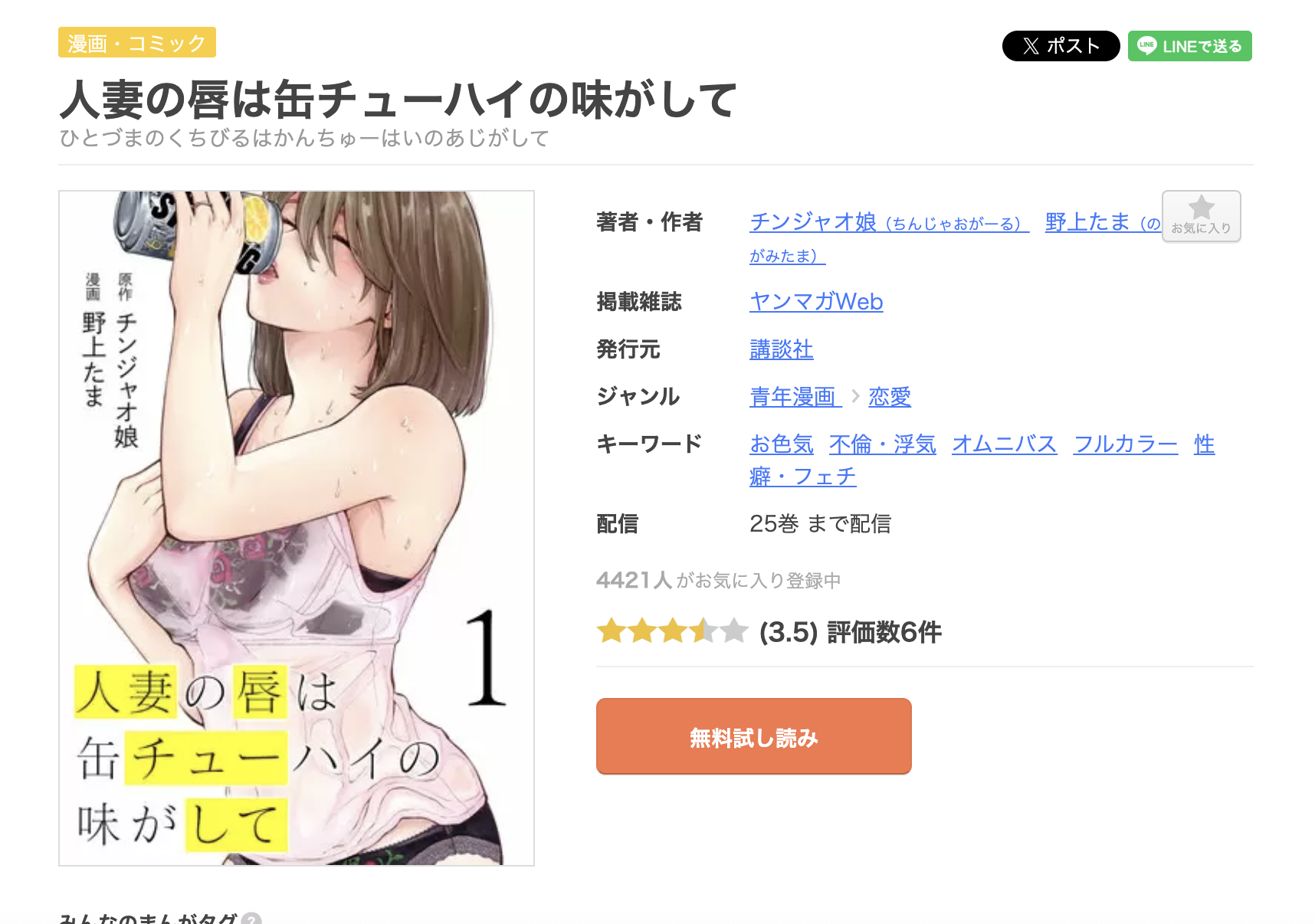 現在、漫画《人妻の唇は缶チューハイの味がして》は25巻まで配信されています。