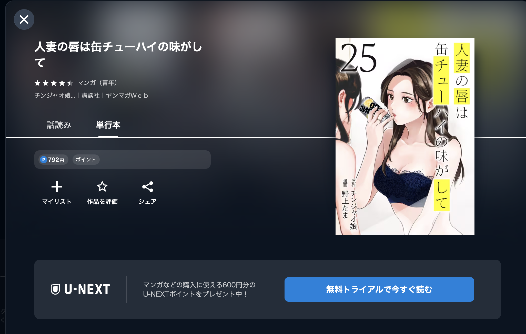 無料では読めませんが、U-NEXTのお試し期間を使って、600円引きで漫画《人妻の唇は缶チューハイの味がして》を読む手順をまとめました。