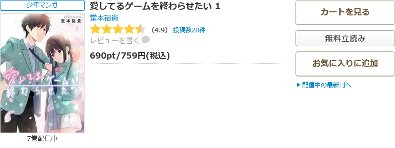 全巻無料ではないものの、クーポンやポイント還元で一番お得に漫画《愛してるゲームを終わらせたい》を読むことができます。