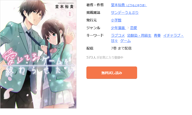 漫画《愛してるゲームを終わらせたい》は、サンデーうぇぶりで連載されている漫画で、単行本は全7巻まで発売されています。