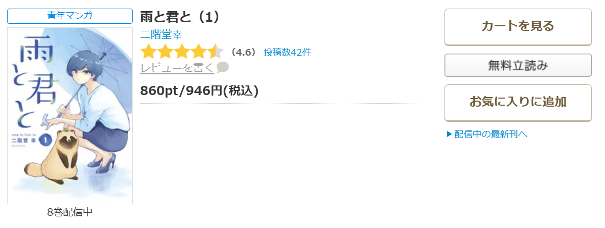 全巻無料ではないものの、クーポンやポイント還元で一番お得に漫画《雨と君と》を読むことができます。