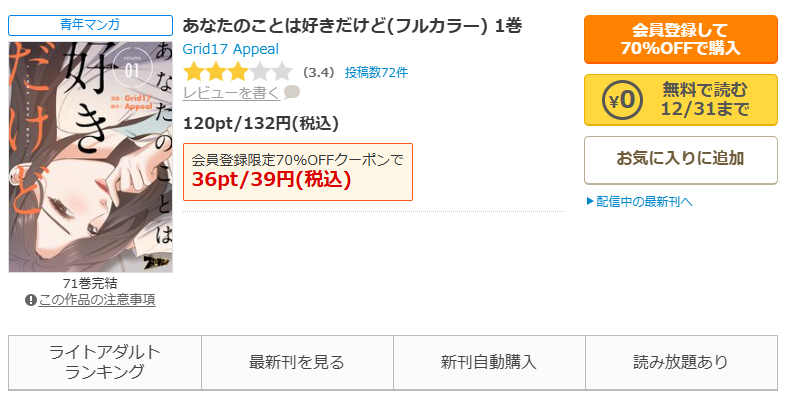 全巻無料ではありませんが、複雑な条件なく漫画《あなたのことは好きだけど》を7割引きで読めるので、おすすめの電子書籍サイトです。