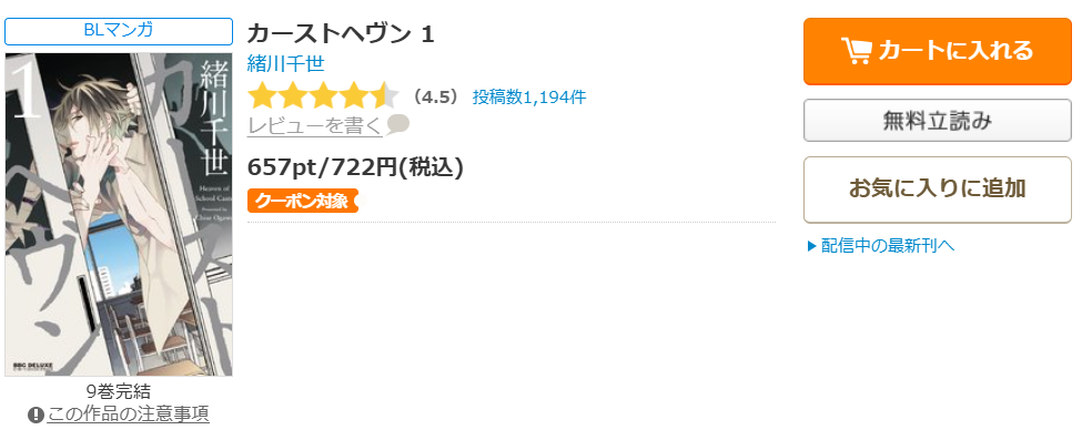 全巻無料ではないものの、クーポンやポイント還元で一番お得に漫画《カーストヘヴン》を読むことができます。