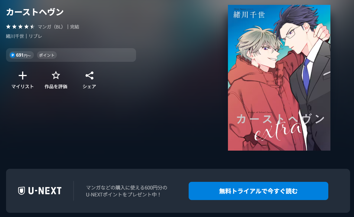 このように、全巻無料では読めませんが、U-NEXTなら初回無料ポイントとポイント還元でお得に漫画《カーストヘヴン》の全巻をまとめ買いできますよ。