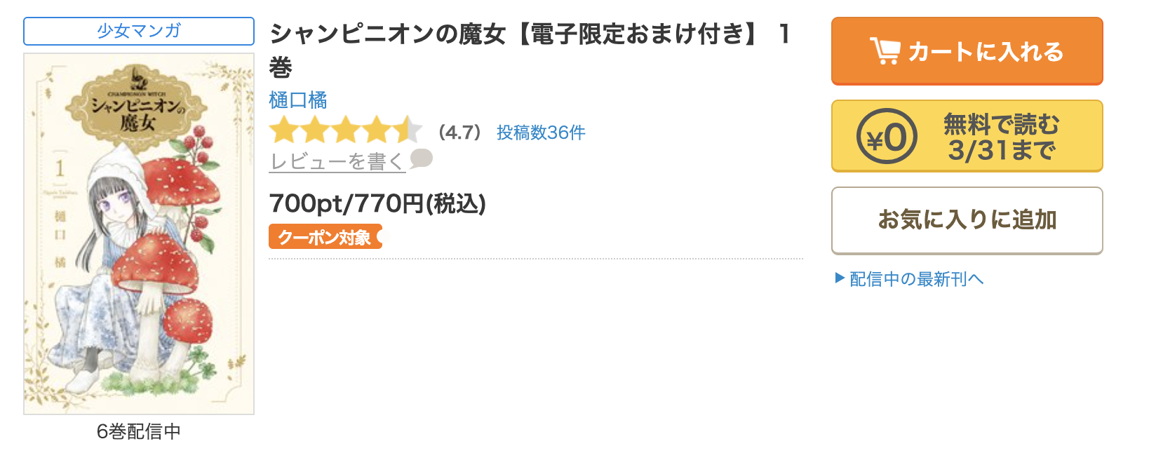 以上のクーポン、ポイント還元の二つの初回特典を使用することで、漫画《シャンピニオンの魔女》の全巻をお得にまとめ買いすることができます。