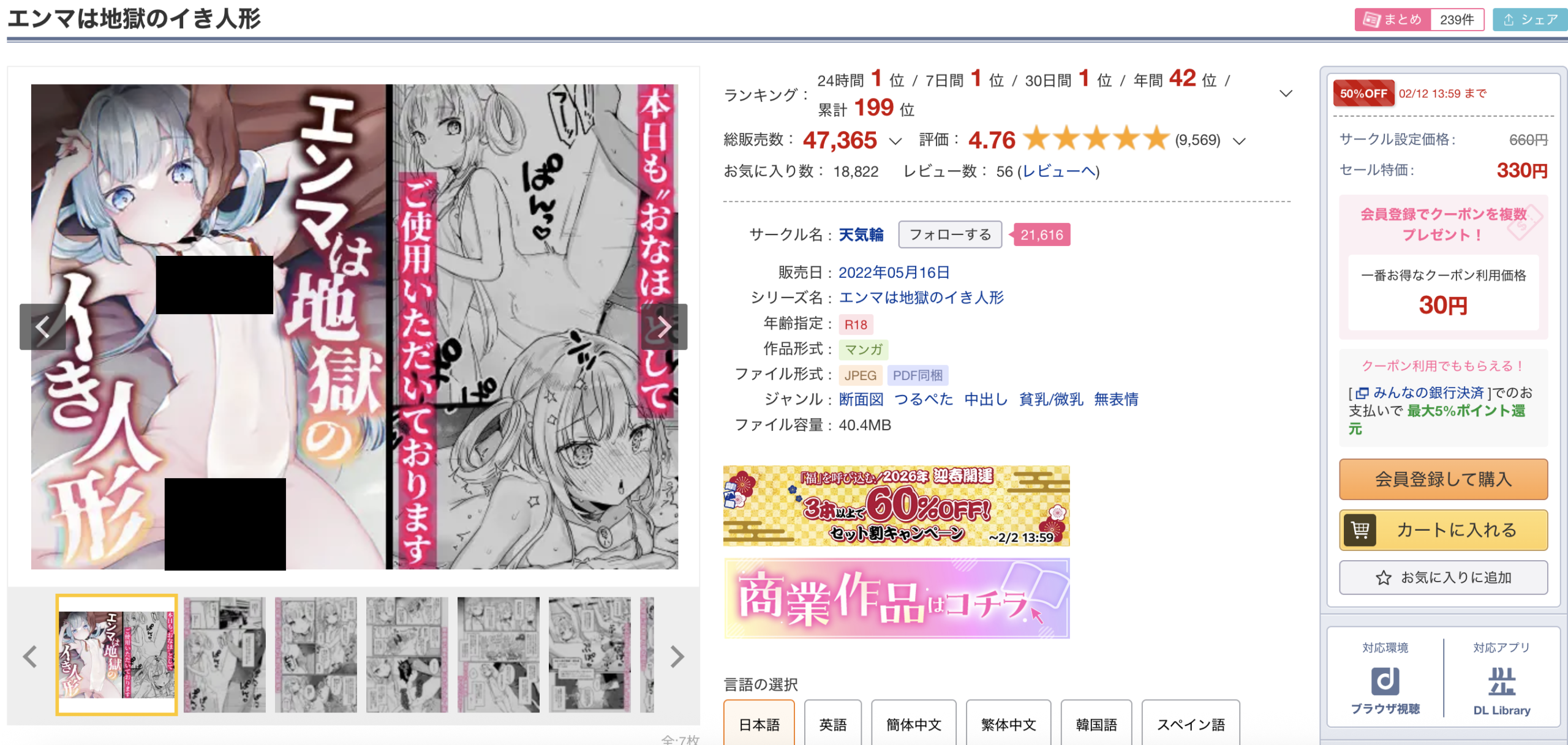 《エンマは地獄のイき人形》のような漫画はもちろん、ゲームや音声作品、ノベルなどを扱っている、国内でも最大級の同人作品販売サイトです。