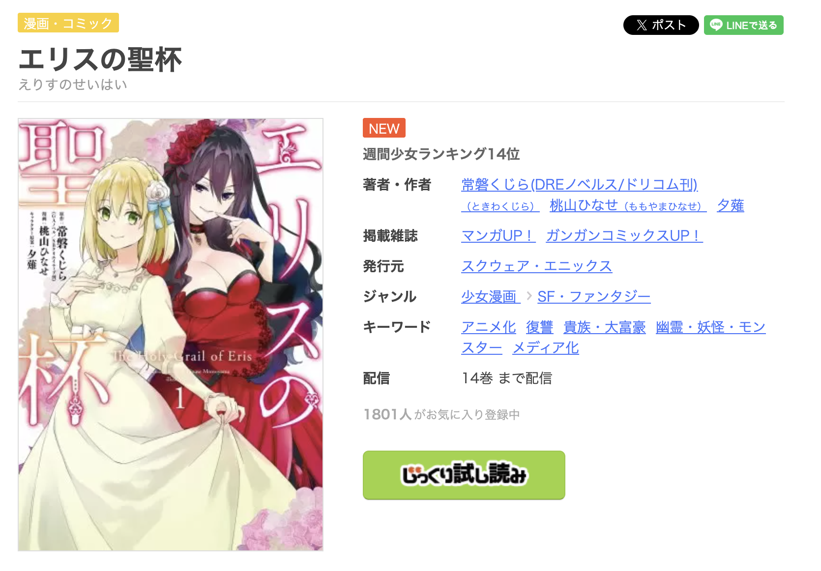 漫画《エリスの聖杯》は、マンガUP!で連載されている漫画で、単行本は全14巻まで発売されています。