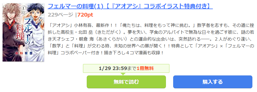 全巻無料ではありませんが、複雑な条件なく漫画《フェルマーの料理》を7割引きで読めるので、おすすめの電子書籍サイトです。
