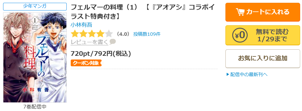 全巻無料ではないものの、クーポンやポイント還元で一番お得に漫画《フェルマーの料理》を読むことができます。