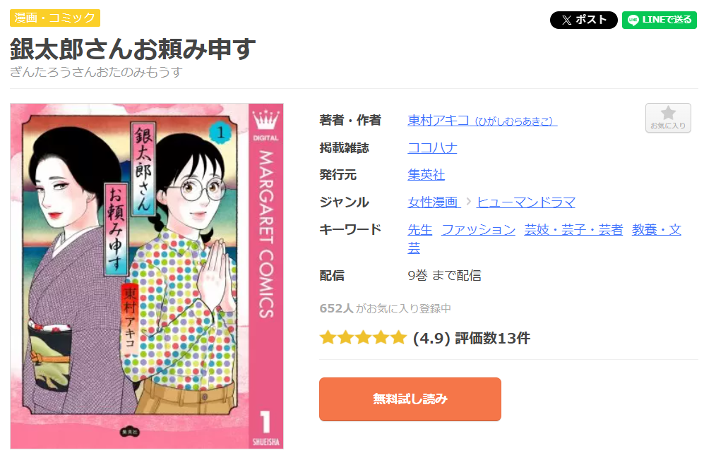 漫画《銀太郎さんお頼み申す》は、マーガレットコミックスDIGITAL / ココハナで連載されている漫画で、単行本は全9巻まで発売されています。