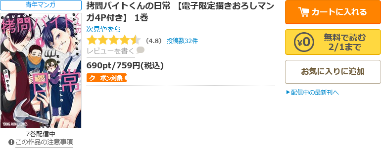 無料ではないものの、クーポンやポイント還元で一番お得に漫画《拷問バイトくんの日常》を読むことができます。