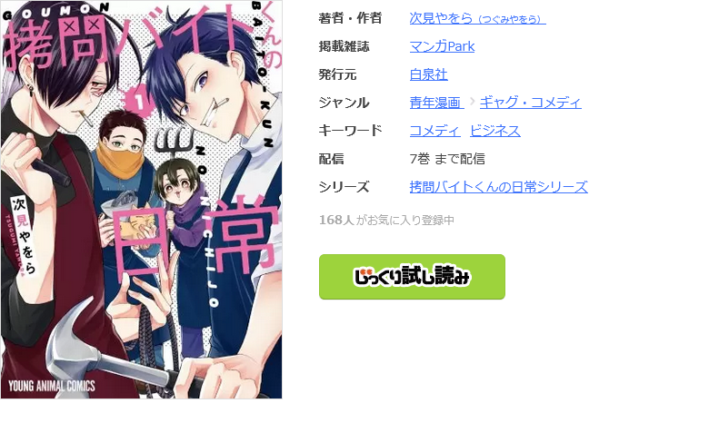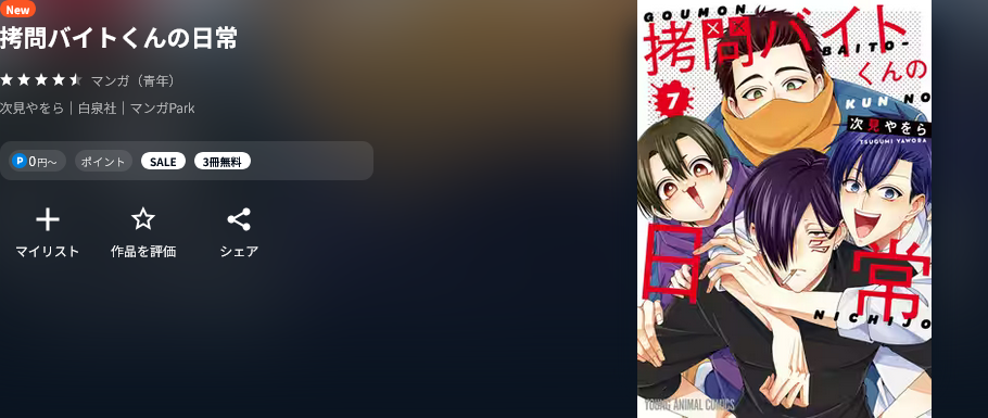 漫画《拷問バイトくんの日常》は、マンガPark / ヤングアニマルコミックスにて連載されている漫画で、単行本は7巻まで発売されています。