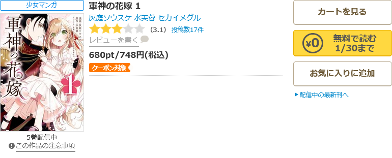 全巻無料ではないものの、クーポンやポイント還元で一番お得に漫画《軍神の花嫁》を読むことができます。
