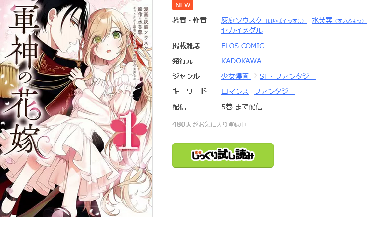漫画《軍神の花嫁》は、FLOS COMICで連載されている漫画で、単行本は全5巻まで発売されています。