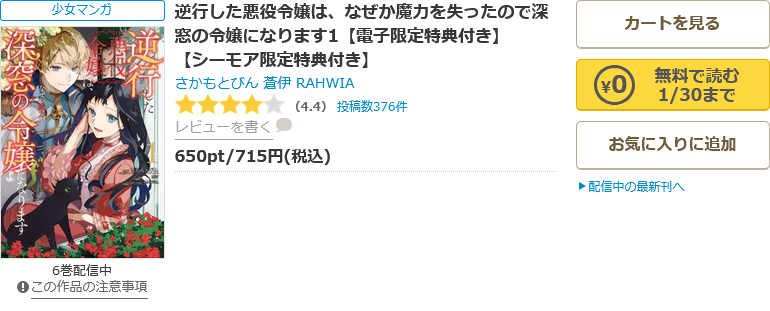 以上の手順で、漫画《逆行した悪役令嬢は、なぜか魔力を失ったので深窓の令嬢になります》を600円引きで読むことができます。