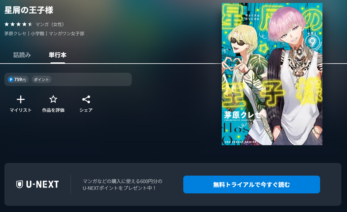 このように、全巻無料では読めませんが、U-NEXTなら初回無料ポイントとポイント還元でお得に漫画《星屑の王子様》の全巻をまとめ買いできますよ。