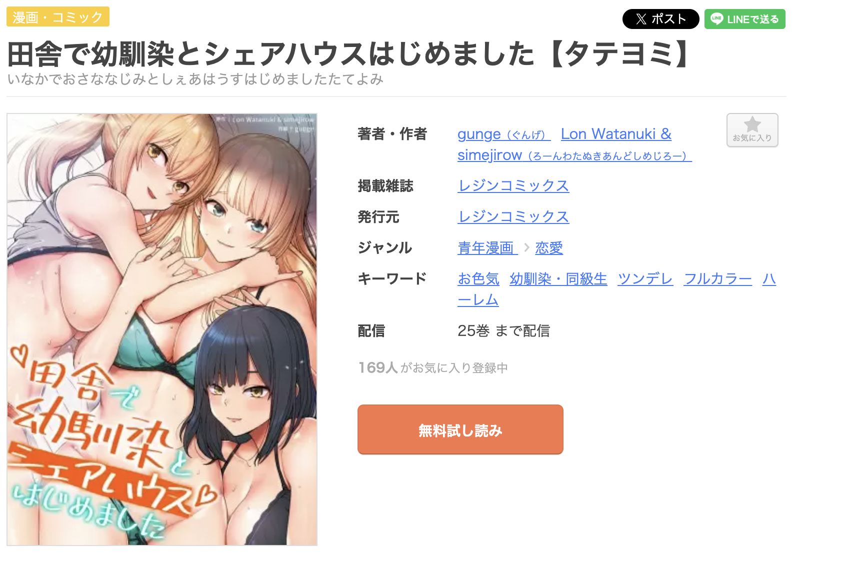 漫画《田舎で幼馴染とシェアハウスはじめました》は、レジコミ Redで連載されている漫画で、全25巻まで発売されています。