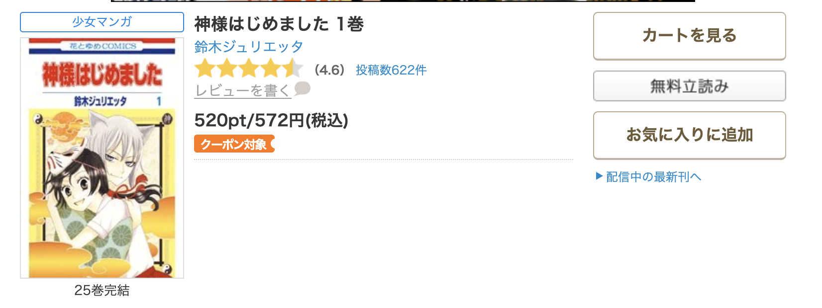 全巻無料ではないものの、クーポンやポイント還元で一番お得に漫画《神様はじめました》を読むことができます。
