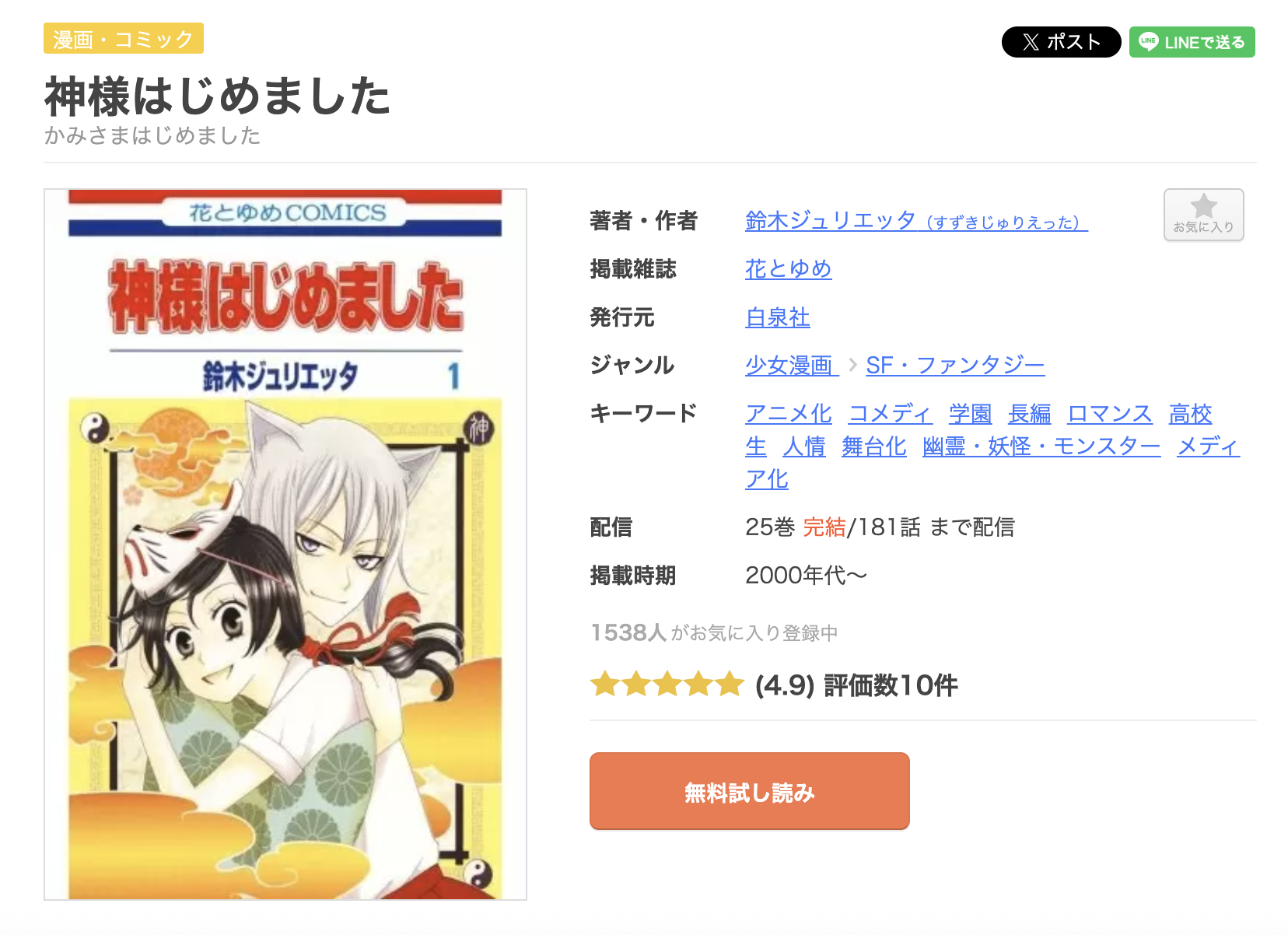 次に、漫画《神様はじめました》を全話無料(全巻無料)で読める、または無料で読めるマンガアプリがあるかどうかをまとめました。