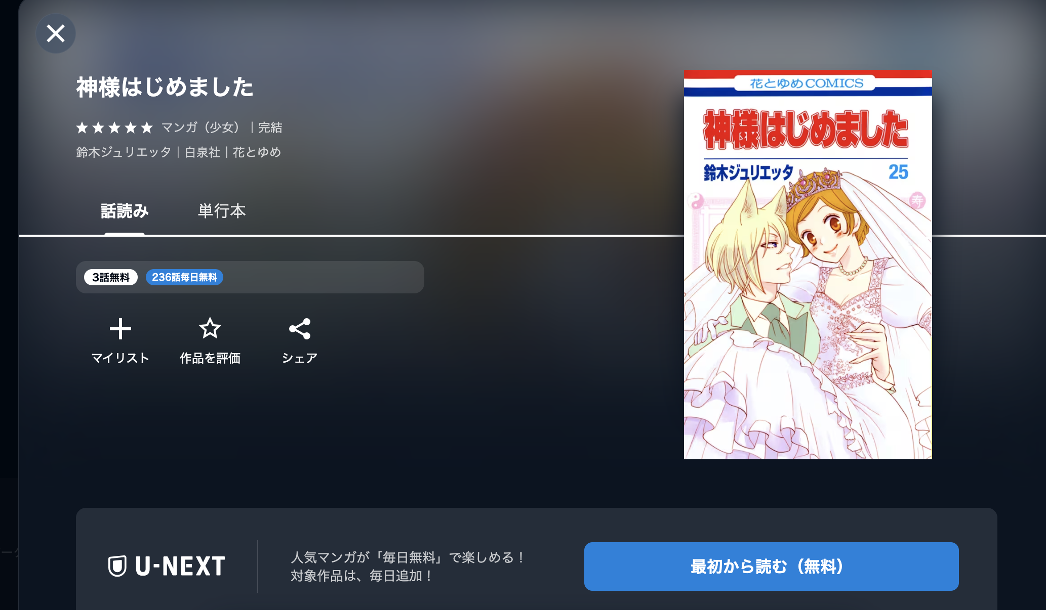 U-NEXTでは、漫画《神様はじめました》を全巻無料で読むことはできません。