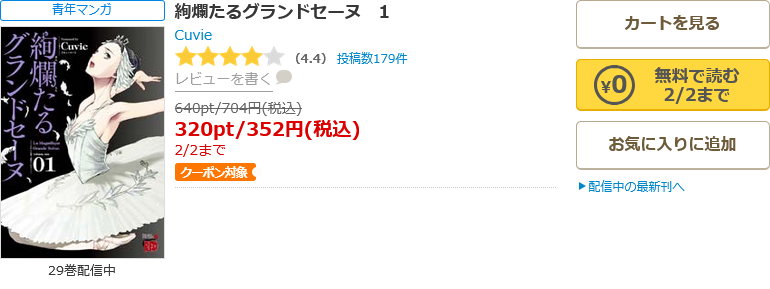 全巻無料ではないものの、クーポンやポイント還元で一番お得に漫画《絢爛たるグランドセーヌ》を読むことができます。