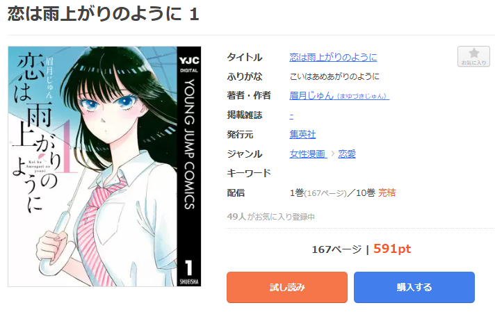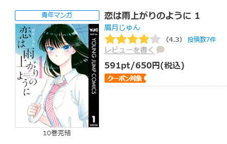 全巻無料ではないものの、クーポンやポイント還元で一番お得に漫画《恋は雨上がりのように》を読むことができます。