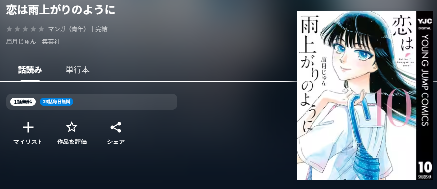 全巻無料で読めなくても、「最終巻だけでも無料で読みたい」というあなたのために、漫画《恋は雨上がりのように》の最終巻(10巻)を無料で読める電子書籍サイトやマンガアプリがあるか調査しました。