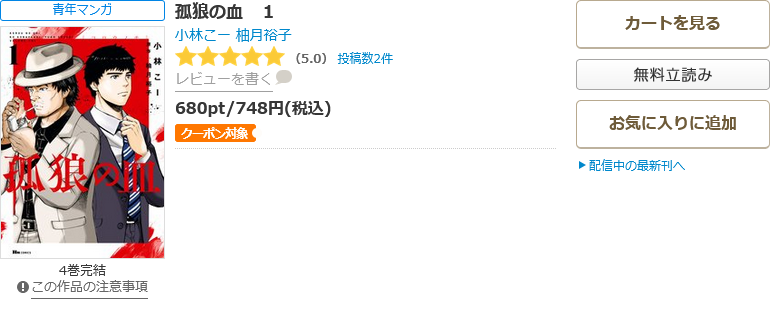 以上のクーポン、ポイント還元の二つの初回特典を使用することで、漫画《孤狼の血》の全巻をお得にまとめ買いすることができます。