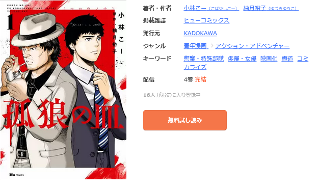 現在、漫画《孤狼の血》は4巻まで配信されています。