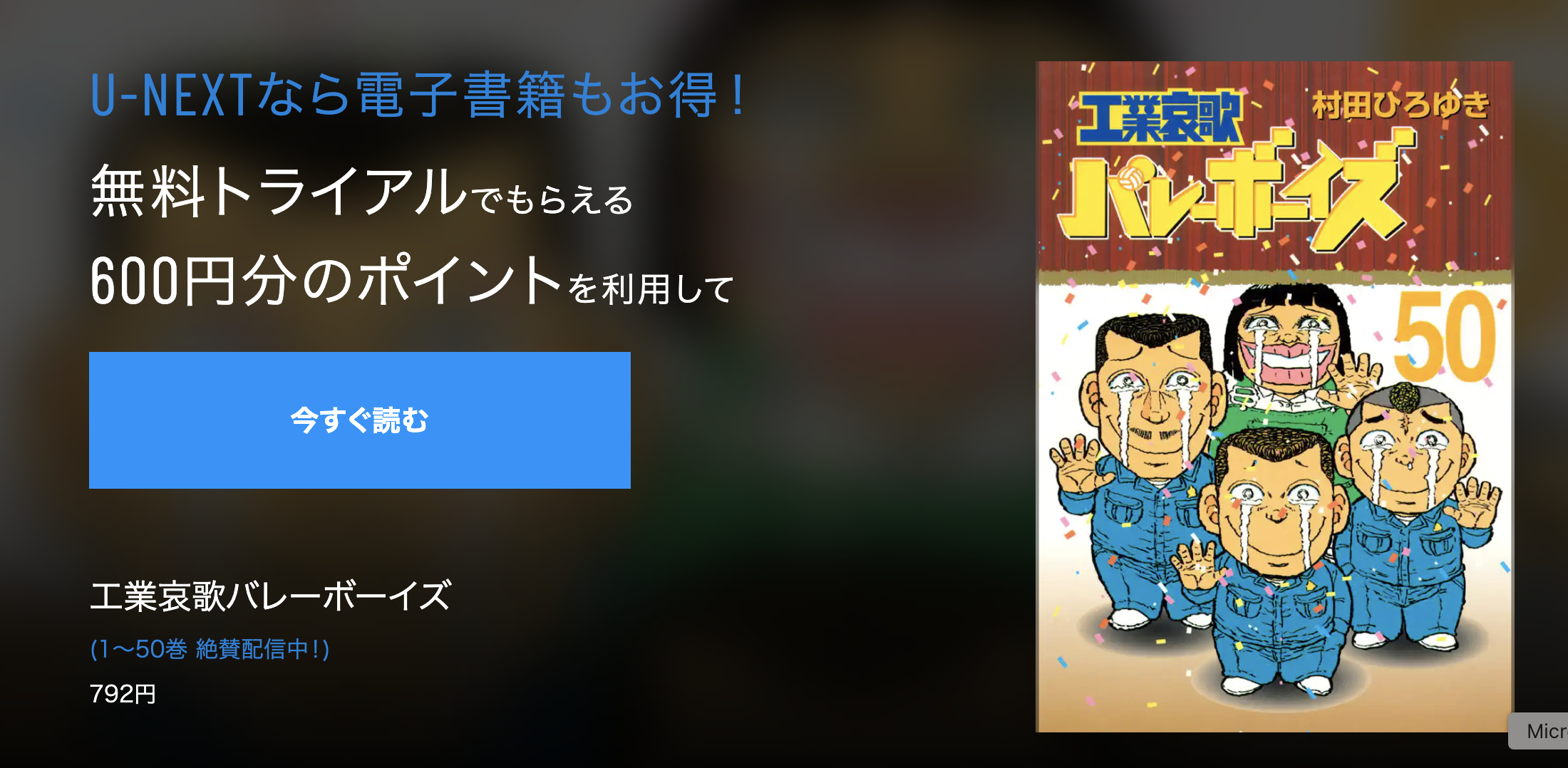 無料では読めませんが、U-NEXTのお試し期間を使って、600円引きで漫画《工業哀歌バレーボーイズ》を読む手順をまとめました。