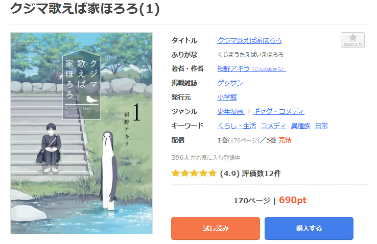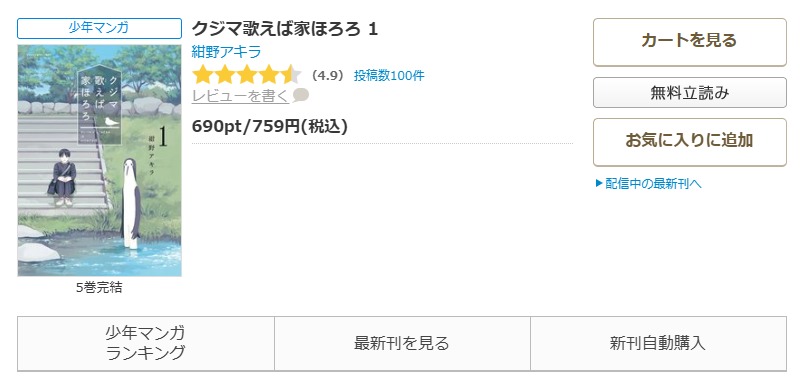 全巻無料ではないものの、クーポンやポイント還元で一番お得に漫画《クジマ歌えば家ほろろ》を読むことができます。。
