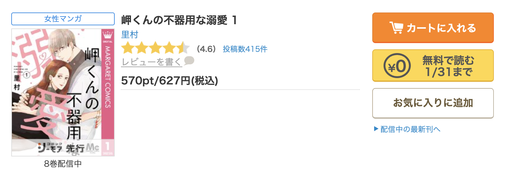 漫画《岬くんの不器用な溺愛》は、マーガレットコミックスDIGITAL/ココハナで連載されている漫画で、単行本は全8巻まで発売されています。
