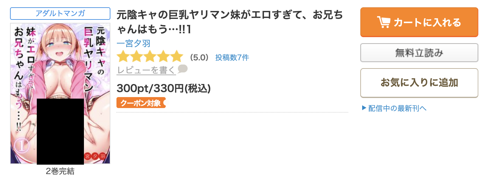 漫画《元陰キャの巨乳ヤリマン妹がエロすぎて、お兄ちゃんはもう…!!》を配信している電子書籍サイトを表にまとめました。