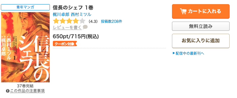 以上のクーポン、ポイント還元の二つの初回特典を使用することで、漫画《信長のシェフ》の全巻をお得にまとめ買いすることができます。
