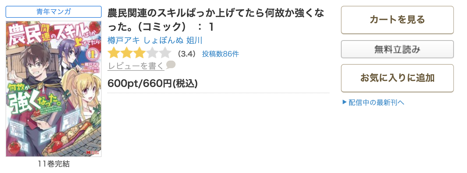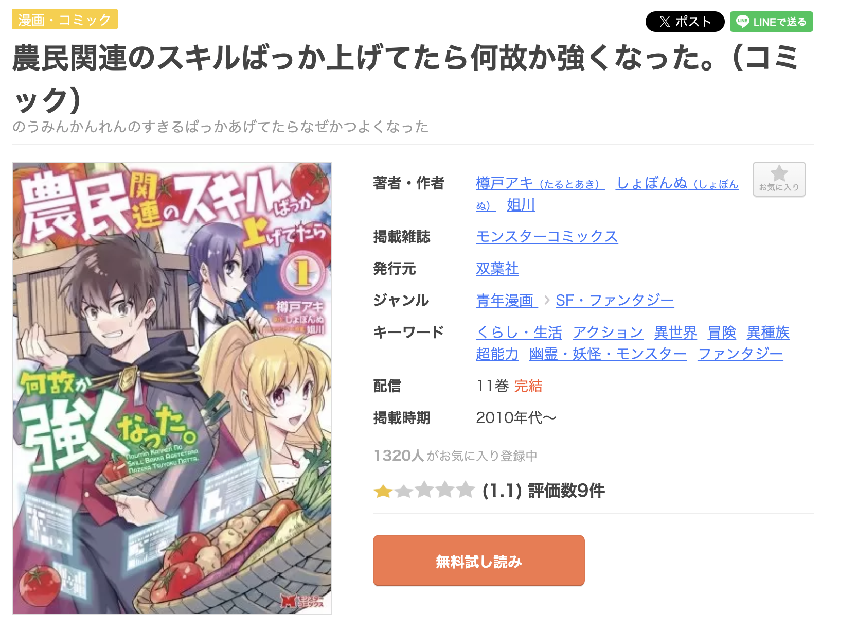 漫画《農民関連のスキルばっか上げてたら何故か強くなった。》は、がうがうモンスターで連載されている漫画で、単行本は全11巻まで発売されています。