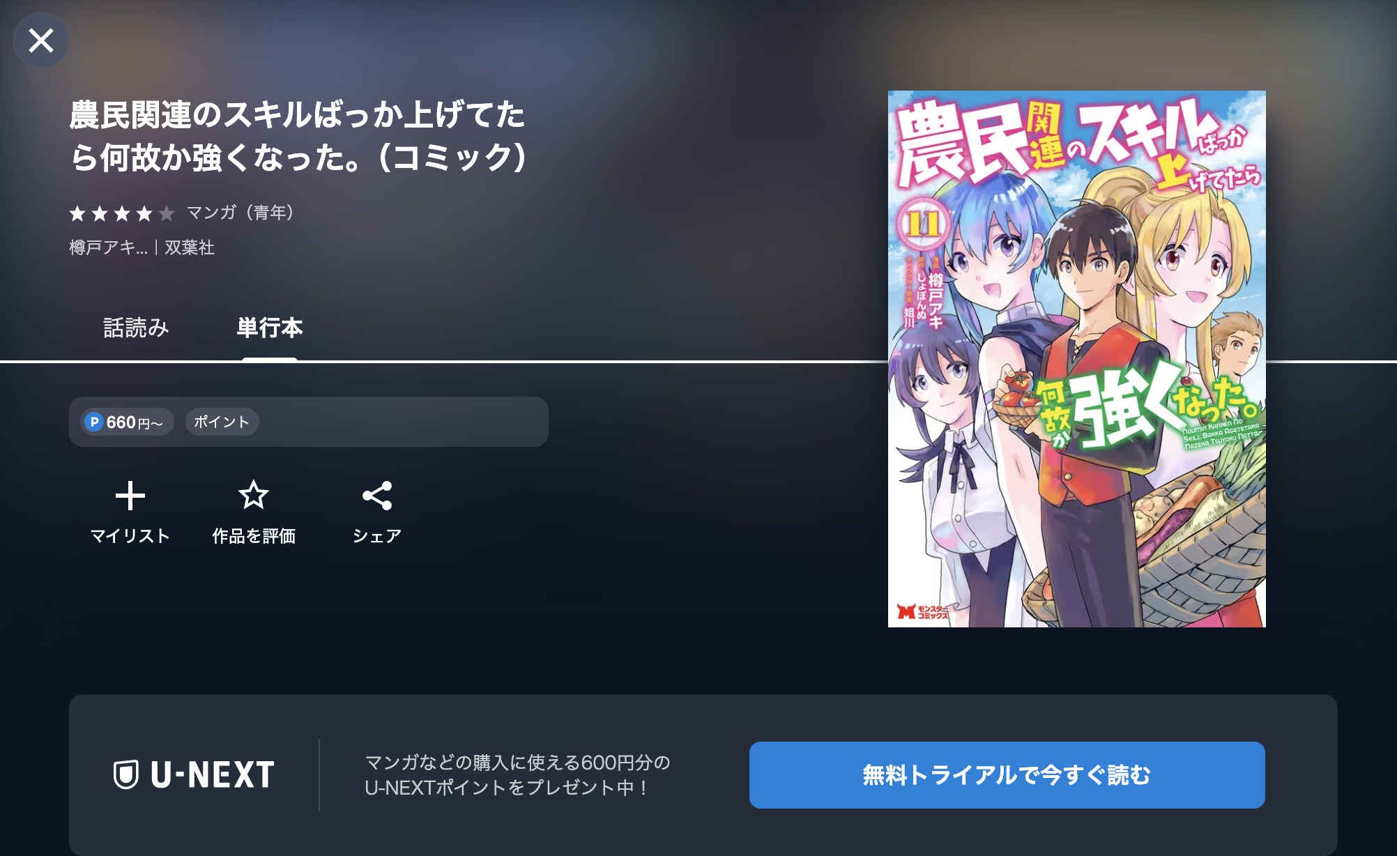 無料では読めませんが、U-NEXTのお試し期間を使って、600円引きで漫画《農民関連のスキルばっか上げてたら何故か強くなった。》を読む手順をまとめました。