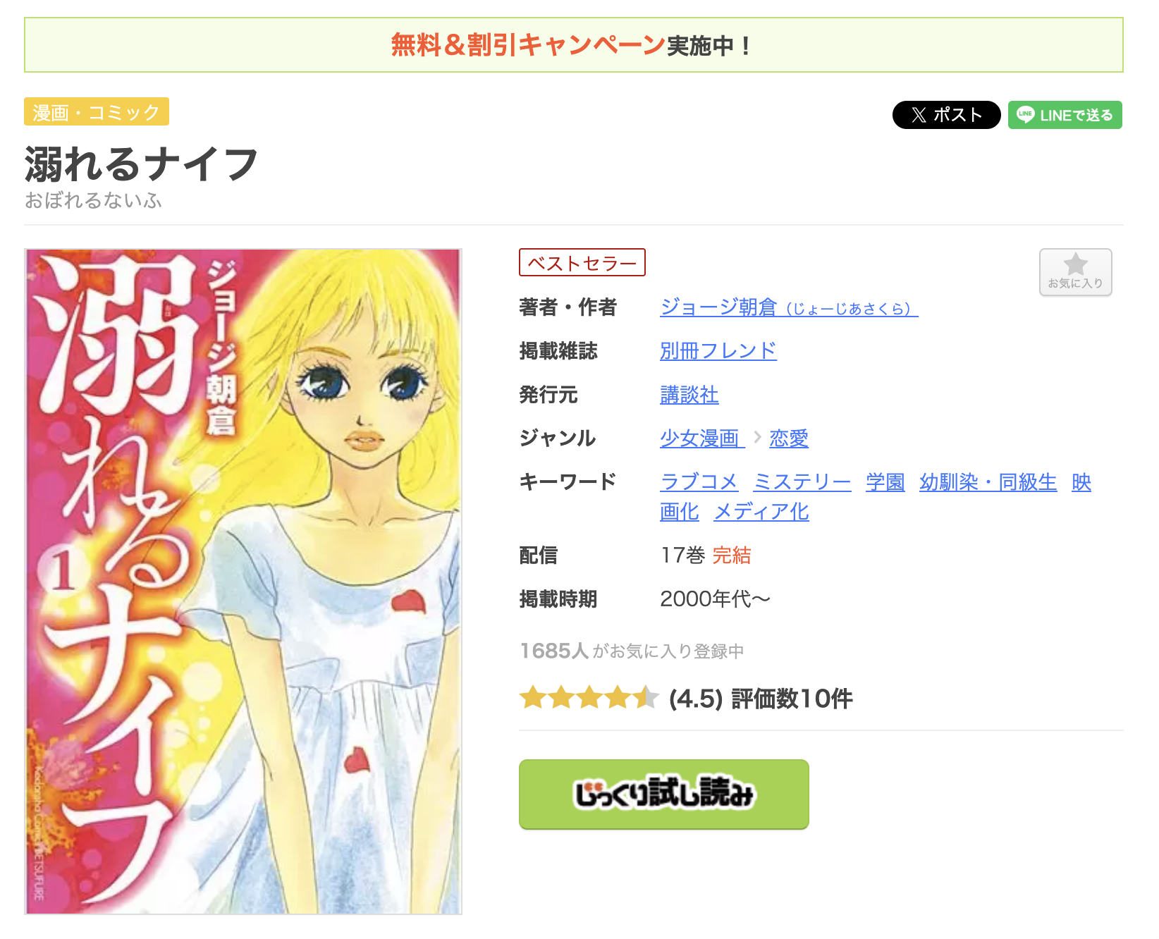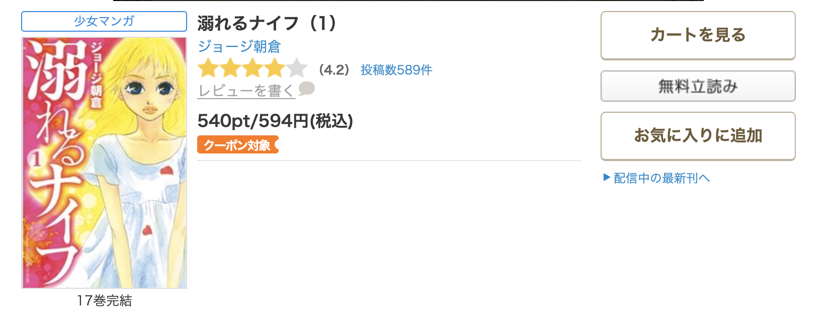 全巻無料ではないものの、クーポンやポイント還元で一番お得に漫画《溺れるナイフ》を読むことができます。
