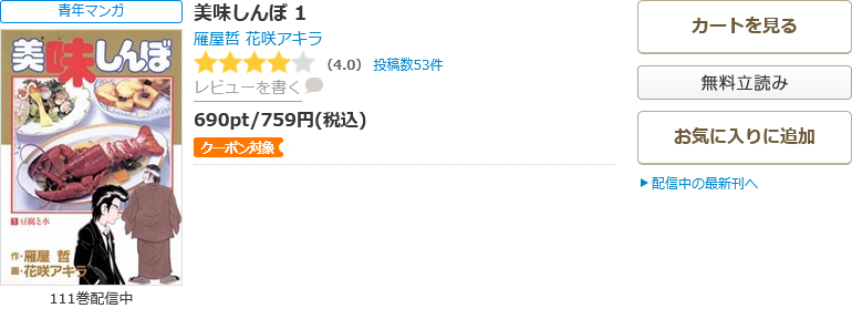 全巻無料ではないものの、クーポンやポイント還元で一番お得に漫画《美味しんぼ》を読むことができます。