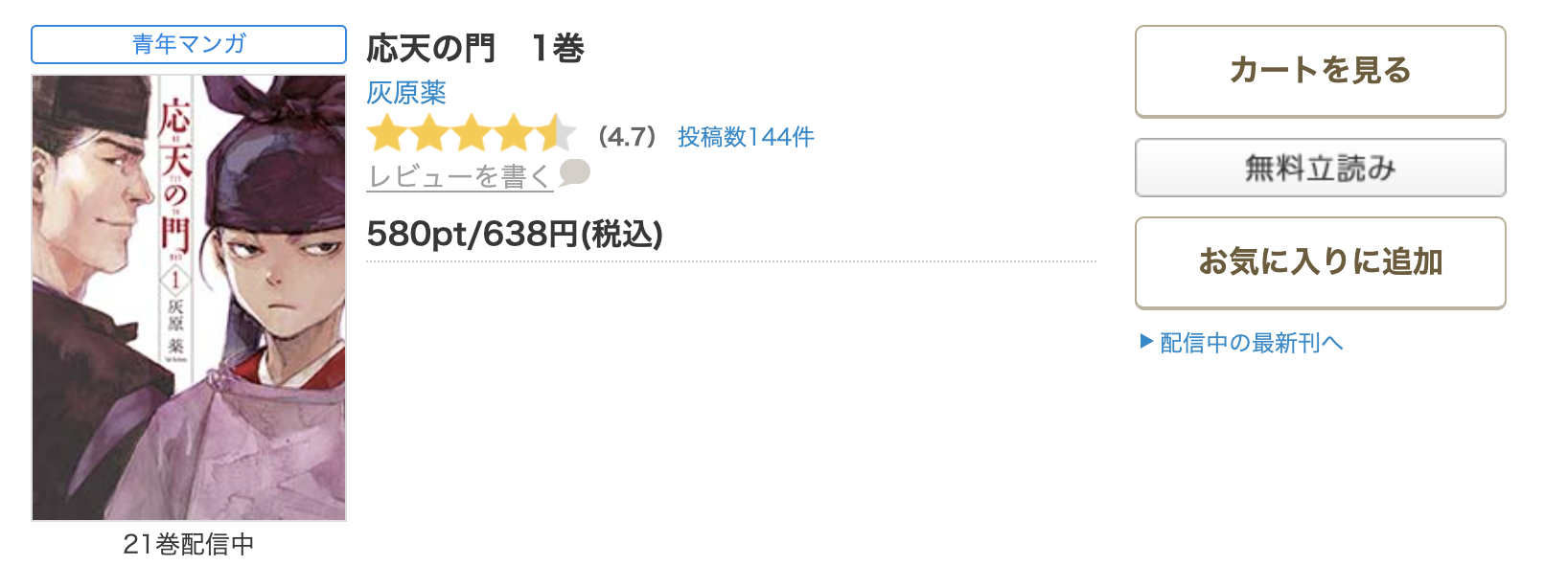 全巻無料ではないものの、クーポンやポイント還元で一番お得に漫画《応天の門》を読むことができます。
