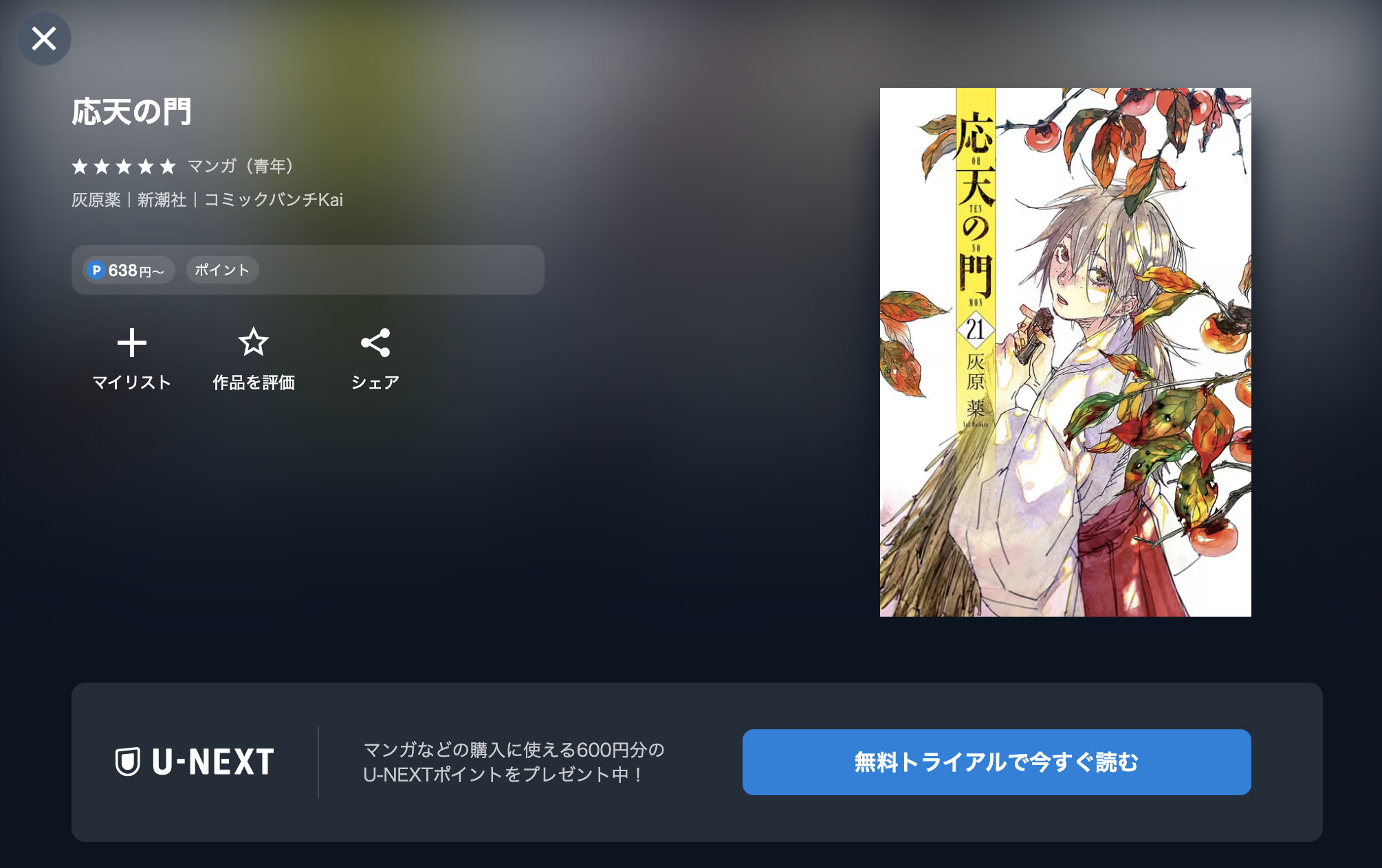無料では読めませんが、U-NEXTのお試し期間を使って、600円引きで漫画《応天の門》を読む手順をまとめました。