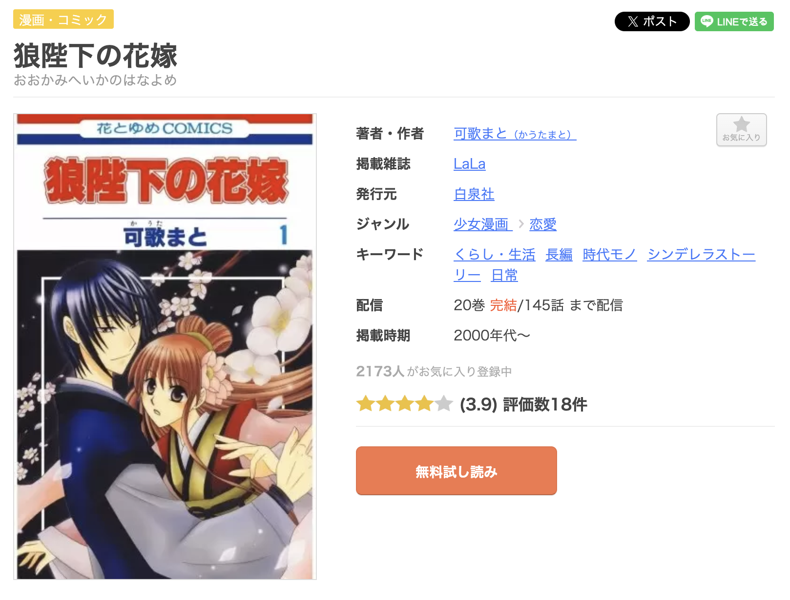 漫画《狼陛下の花嫁》は、LaLaで連載されている漫画で、単行本は全20巻まで発売されています。