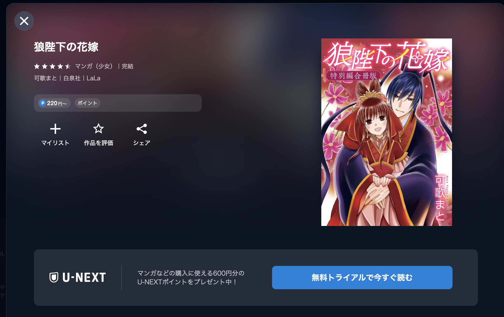 この特典で漫画《狼陛下の花嫁》を1冊70%オフで読むことができるんです。