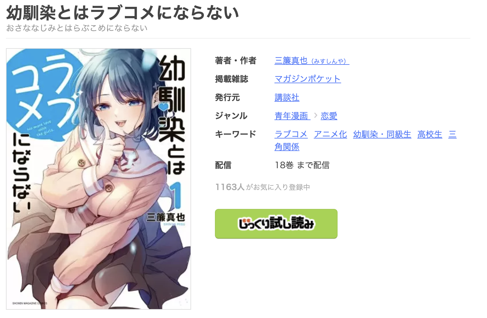 漫画《幼馴染とはラブコメにならない》は、マガジンポケットで連載されている漫画で、単行本は全18巻まで発売されています。