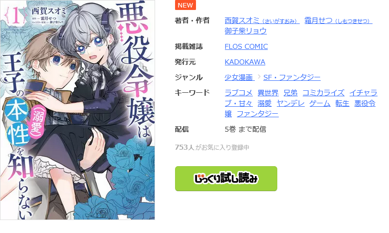 漫画《悪役令嬢は王子の本性(溺愛)を知らない》は、FLOS COMICで連載されている漫画で、単行本は全5巻まで発売されています。