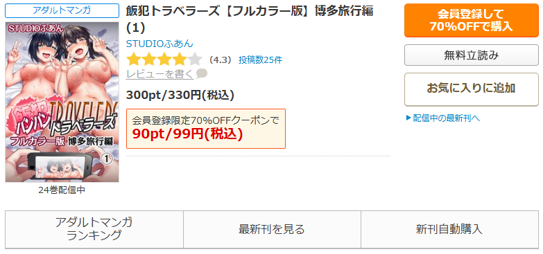 全巻無料ではありませんが、複雑な条件なく漫画《飯犯トラベラーズ》を7割引きで読めるので、おすすめの電子書籍サイトです。
