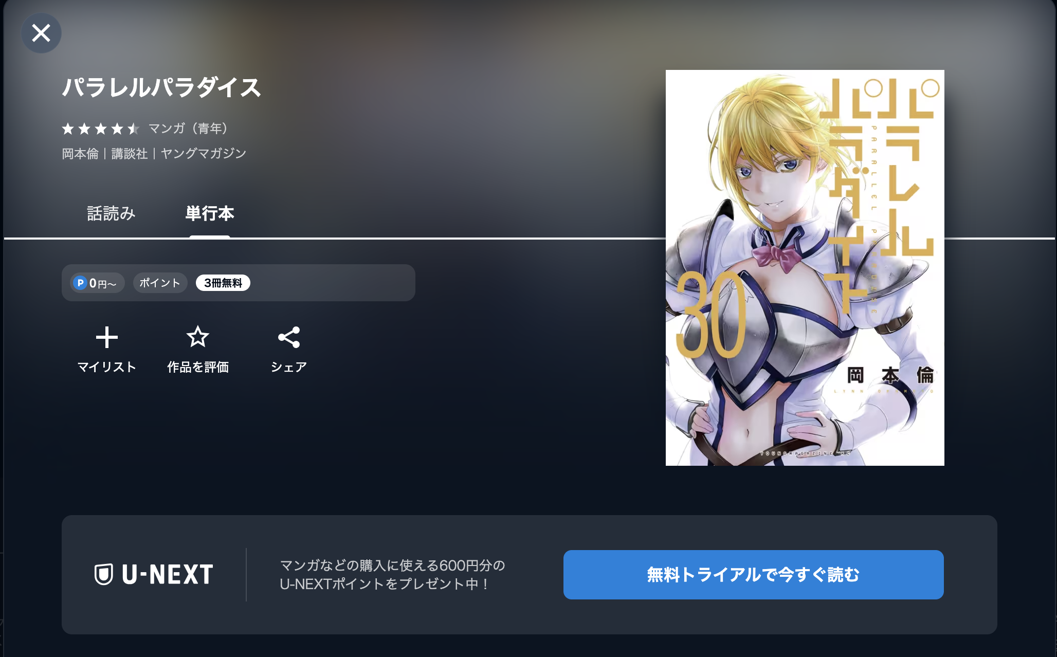 この特典で漫画《パラレルパラダイス》を1冊70%オフで読むことができるんです。